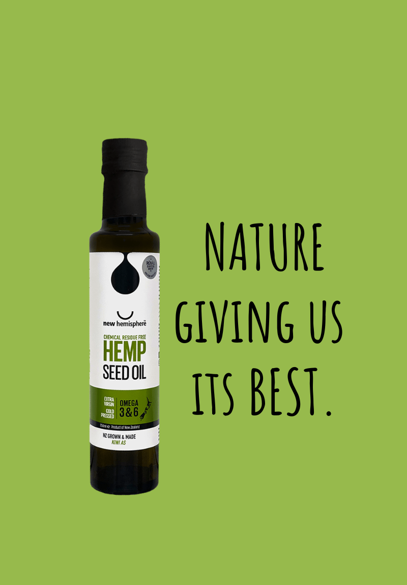 Hemp seed oil is a natural oil made by cold-pressing the seeds of the hemp plant (Cannabis sativa). It contains no THC and is rich in omega-3 and omega-6 fatty acids, antioxidants, and vitamins that support skin, heart, and joint health. New Hemisphere’s Hemp Seeds and Hemp Seed Oil come from hemp plants grown in NZ, on our own farms – this means we have control of the whole production process and can assure they are non-GMO, and chemical residue free (meaning they’re as clean as clean can be).